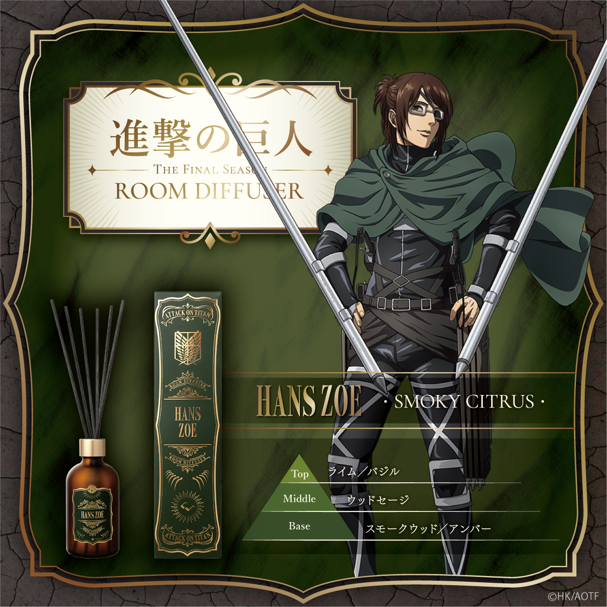 ラストノートは、使命を全うし旅立ったハンジの姿をスモークウッドで表現、甘く燻るアンバーが戦友へ希望を託したハンジの魂を映し出します。