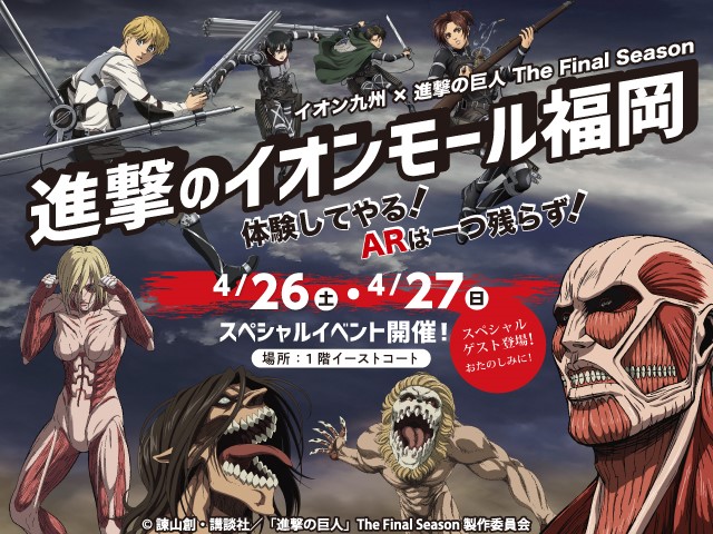 4月26日(土)・4月27日(日)の両日13時30分から、イオンモール福岡1階イーストコートにて『進撃の巨人』とのコラボイベントを開催します!