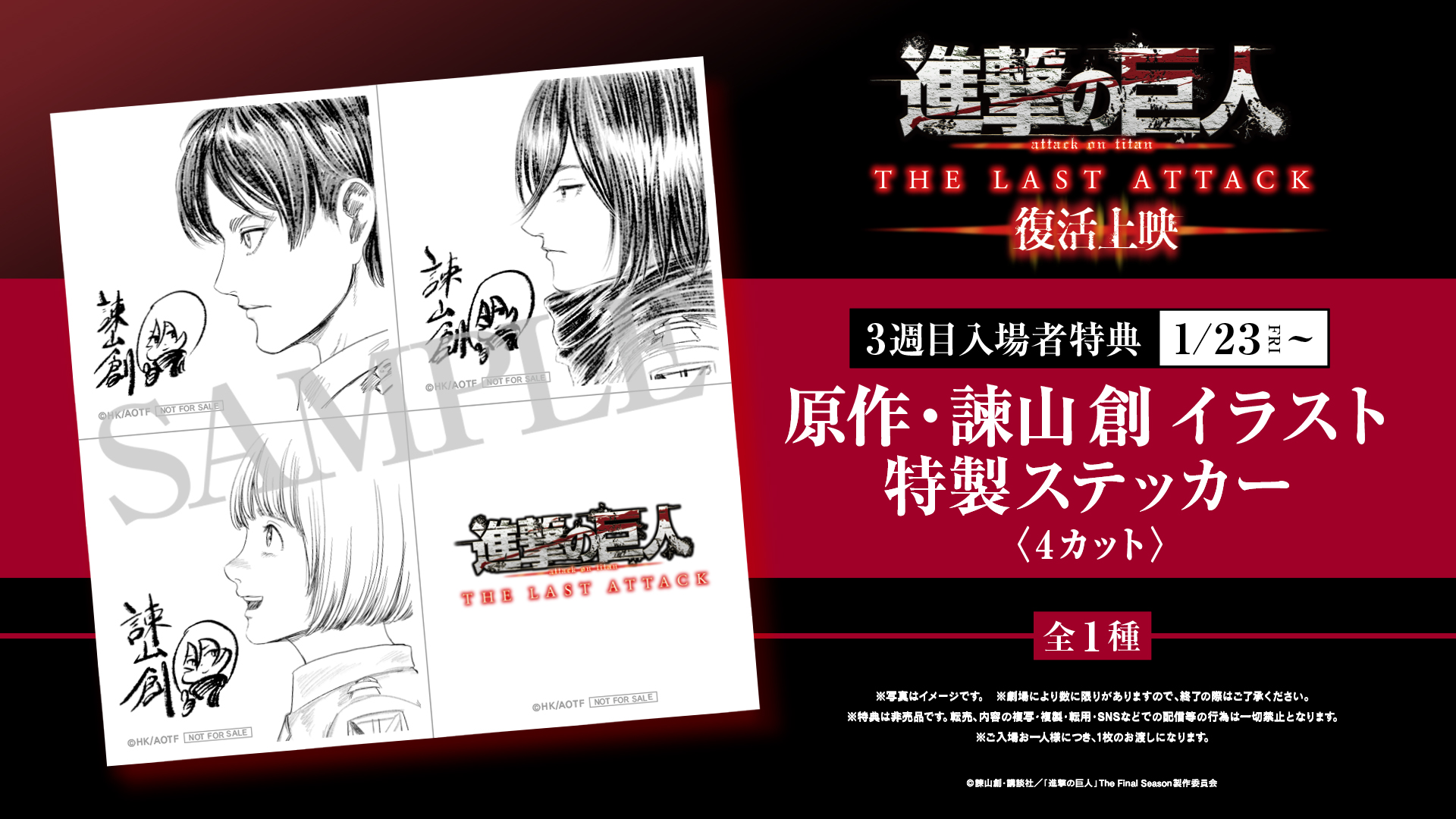1月23日(金)より配布となる第3弾入場者特典は、原作・諫山創が描いたエレン、ミカサ、アルミン幼馴染3人とロゴの4種類が組み合わさった特製ステッカー!