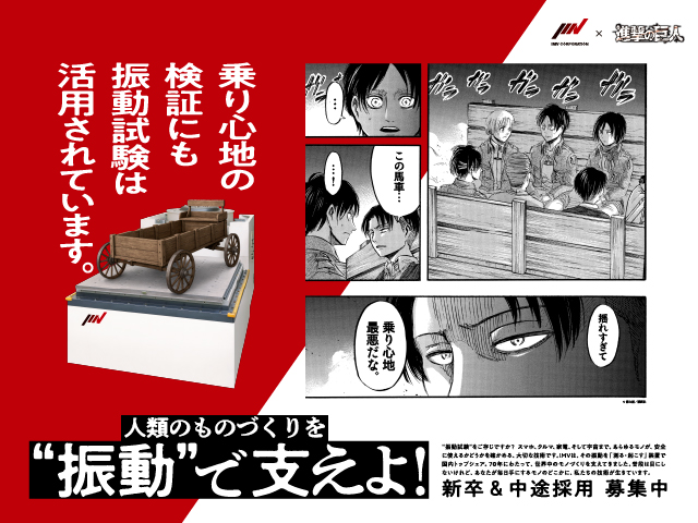 2025年9月22日(月)~10月31日(金)の間、「振動」を中心とした環境試験・計測・解析装置の製造・販売を事業とするIMV株式会社と「進撃の巨人」がコラボした交通広告企画「人類のものづくりを“振動”で支えよ!キャンペーン」を実施!
