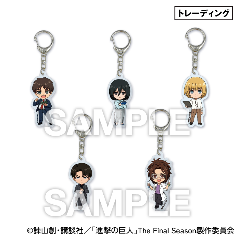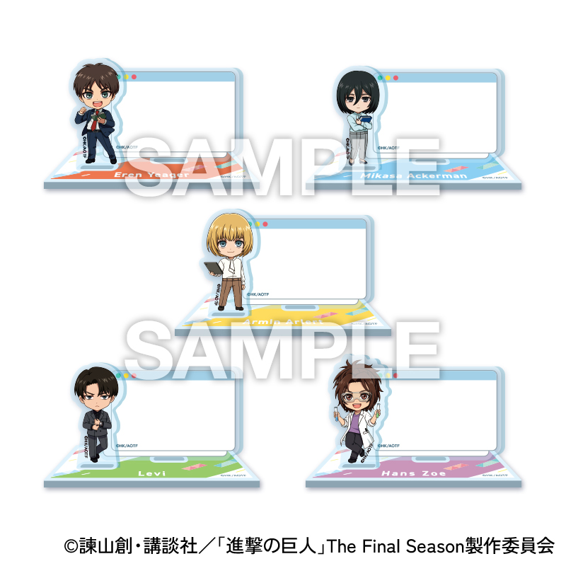 「社会人」をテーマに、エレン、ミカサ、アルミン、リヴァイ、ハンジのオリジナル描き起こしイラストが登場!フレーム切手を中心に、証明写真風ブロマイドや「残業駆逐」デザインの缶バッジなど、描き起こしイラストに合わせてオフィスに関連したグッズ展開です。