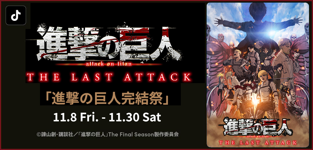 劇場版「進撃の巨人」完結編THE LAST ATTACKの公開を記念して、ショートムービープラットフォーム「TikTok(ティックトック)」とのコラボレーション企画「進撃の巨人完結祭」を開催いたします。