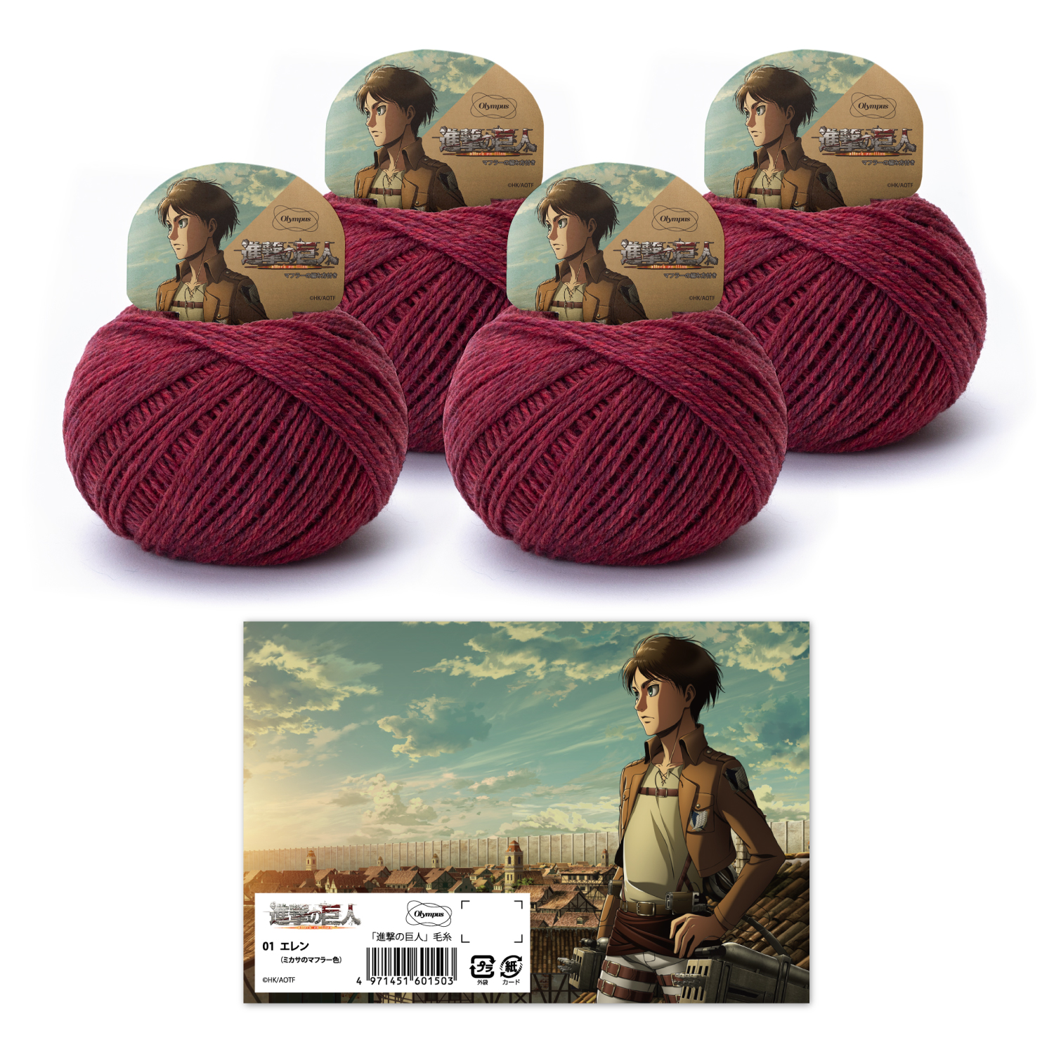 物語のキーアイテム、「エレンが巻いてくれたマフラー」(4玉使用)をイメージした作品が編める毛糸3種(エレン/リヴァイ/巨人)