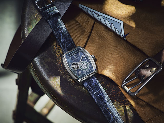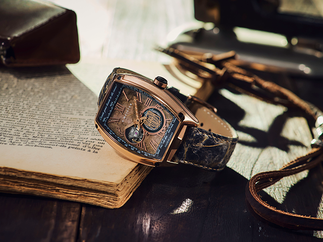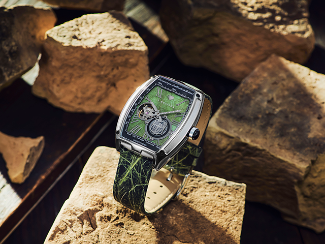 ▼高級感のあるトノー型の腕時計に作品のアイコンを散りばめたこだわりのデザイン